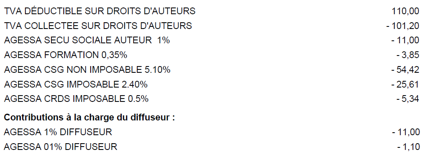 Les cotisations, la TVA, les parts diffuseurs sont détaillés :