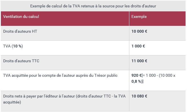 La perception de la TVA peut être effectuée selon deux modes : la retenue à la source, avec reversement par l'éditeur, ou l'option à la TVA pour l'auteur.