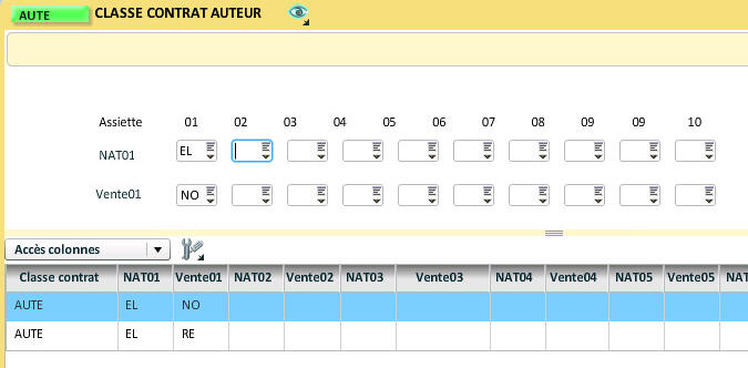 Pour chaque classe de contrats, il est possible de définir des valeurs par défaut sur les assiettes. Dans l'évènement, chaque assiette réserve 2 champs. Celui qui porte la requête (ID1 à I10) est destiné à recevoir le canal de ventes. Le deuxième de (EN1 à E10) accueillera la nature de droits.
