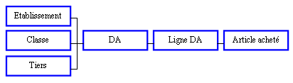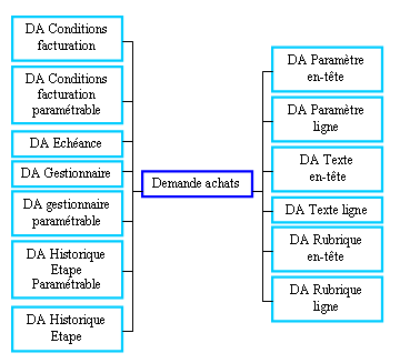 Informations : Etablissement (Intitulés), Classe, Indicateur DA/Commande, Numéro, Sous-numéro, Mnémonique, Marché, Fournisseur, Tiers, Adresse, Nom, Etape, Date de la demande, Date au plus tôt, Date au plus tard, Dépôt, Devise, Langue, Observations.
