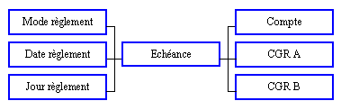 Informations : Echéance, Numéro, Intitulés complet et réduit, Pourcentage, Type de collectif (Intitulés), Mode, Nombre de jours et Date de règlement (Intitulés), Compte (Intitulés), CGR 1 et 2 (Intitulés), Montant, Date.