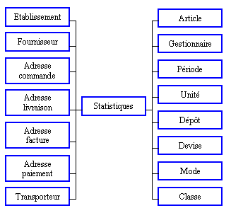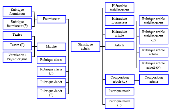 Informations : Type de statistique, Etablissement, Gestionnaire, Nom et prénom du gestionnaire, Fournisseur, Catégorie du fournisseur, Article, Intitulé, Intitulé réduit et Catégorie de l'article, Mode d'achat, Classe, Devise, Période, Type de période, Date de début et de fin de période, Dépôt, Marché, Camion, Intitulé et intitule réduit du camion, référence de l'article chez le fournisseur, Unité, Intitulé et intitulé réduit de l'unité.