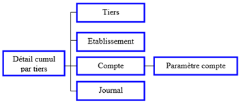 Informations : Tiers, Compte, Journal, Type de cumul, Etablissement, Mois au format date et base, Intitulé du mois du cumul, Année, Trimestre et Mois du cumul par tiers, Débit - Crédit et Crédit - Débit en devise de référence, Débit et Crédit en devise de référence, Nature, Etat.