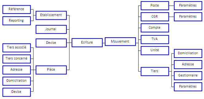 Informations : Numéro écriture, Date comptable, Journal, Type Ecriture, Pièce, Type pièce, Etat, Libellé, Libellé complémentaire, Devise, Devise origine, Etablissement, Année comptable, Mois comptable.