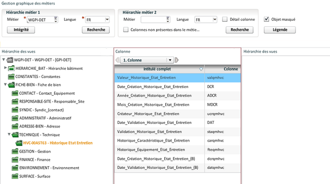 Les valeurs des caractéristiques d'un bien peuvent être historisées (en fonction du paramétrage de la caractéristique). Cet historique peut être mis à disposition dans le métier client "Gestion du parc immobilier", pour cela vous devez intégrer le métier paramétrable "Maintenance - Historique caractéristiques équipements (P)" pour chaque caractéristique concernée.
