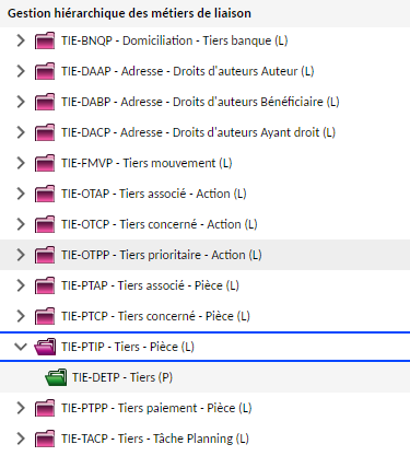 Ce bloc permet de visualiser les métiers de liaison de façon hiérarchique avec les métiers paramétrables associés triés suivant leur ordre.