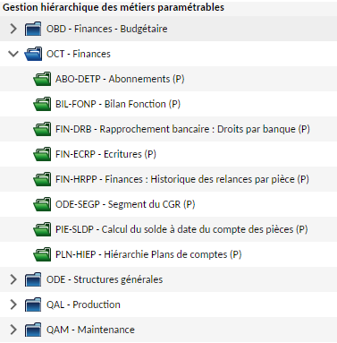 Ce bloc permet de visualiser les métiers paramétrables de façon hiérarchique via leur application.