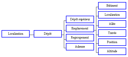 Informations : Dépôt (Intitulés), Abrégé Dépôt, Dépôt physique, Etablissement physique, Tiers, Forme juridique, Dépôt supérieur (Intitulés), Regroupement (Intitulés), Emplacement (Intitulés), Abrégé emplacement, Emplacement supérieur, Gestionnaire emplacement.