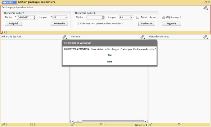 Elle se fait par duplication du métier référence "Suivi budget - Socle" en utilisant la transaction "Gestion graphique des métiers" dans laquelle il faut nommer le métier à créer et lancer la recherche. Le message suivant s'affiche :