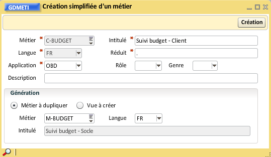 En répondant positivement à la question ci-dessus, la transaction "Création simplifiée d'un métier" s'ouvre, il faut renseigner les informations comme ci-dessous puis cliquer sur le bouton "Création"