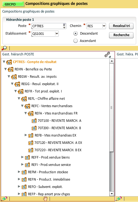 Dans cet exemple, nous allons intégrer la hiérarchie de postes "Compte de résultat", le chemin de composition est "RES" pour Résultat :