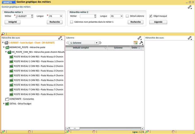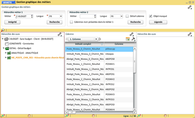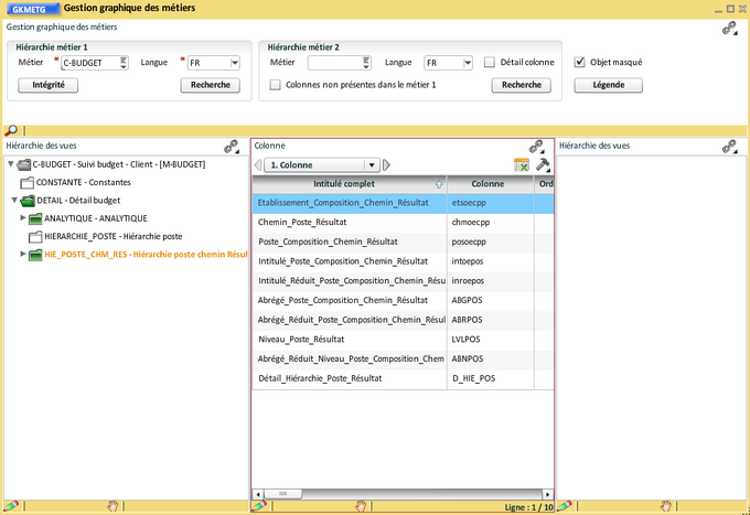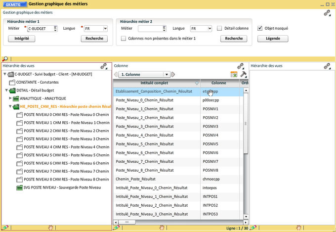 Il est possible de ne pas conserver les 9 niveaux (de 0 à 8) dans des vues séparées, comme pour les hiérarchies de CGR, nous allons déplacer toutes les colonnes restant dans la vue "Hiérarchie poste chemin Résultat". Nous utilisons à nouveau la transaction de "Modification des colonnes de métier" ( ouverte en synchro du bloc colonne et épinglée) :