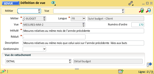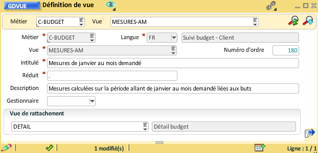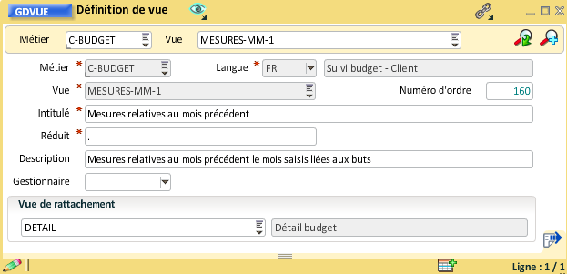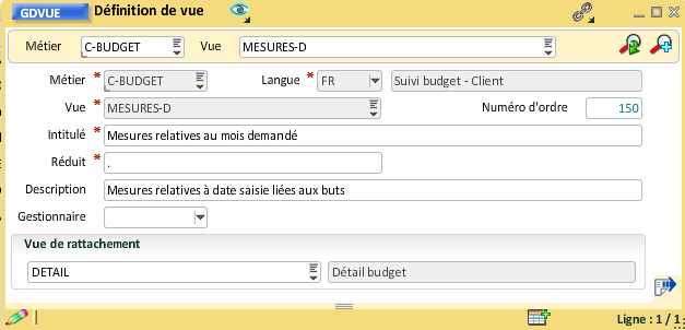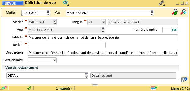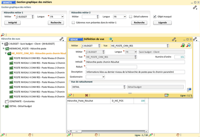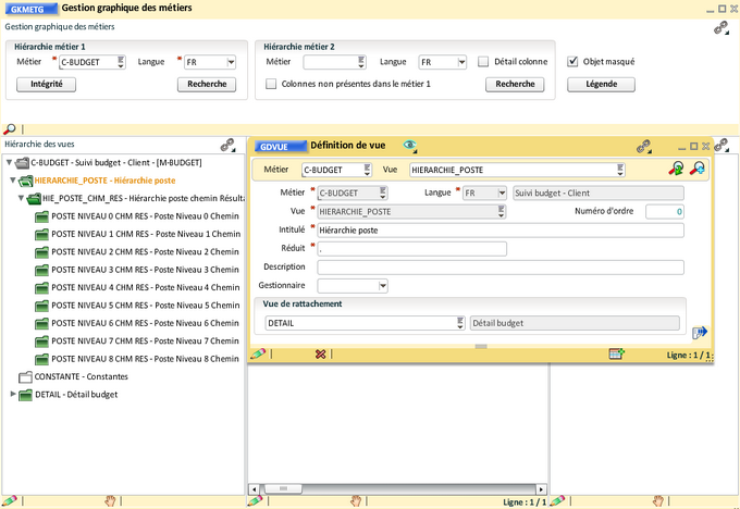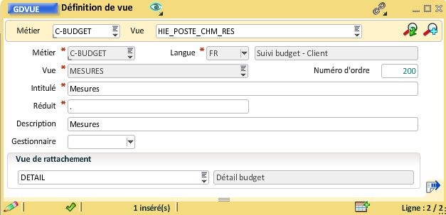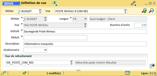 Pour rattacher la vue "Hiérarchie poste" à la vue "Détail budget", il faut ouvrir la gestion des vues et renseigner la vue de rattachement, le numéro d'ordre peut aussi être mis à jour :