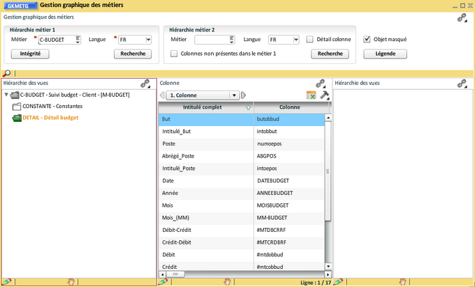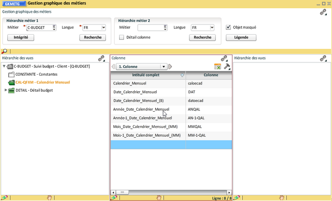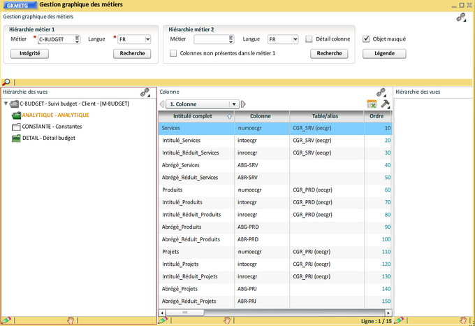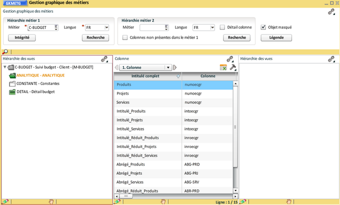 Vous pouvez réorganiser les vues et les colonnes, éventuellement masquer ou supprimer (seulement dans le cas d'un nouveau métier) certaines colonnes :