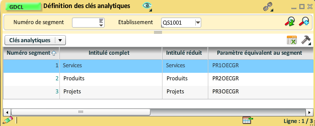Les critères peuvent être différents selon votre définition de la clé analytique, le libellé dans la colonne "Intitulé", le paramètre équivalent au segment dans la colonne "Référence", mais aussi le code et l'alias qui sont des identifiants et que vous pouvez attribuer librement.