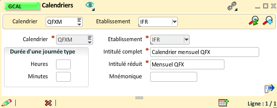 Le calendrier doit être défini dans la gestion des calendriers, dans notre exemple, son identifiant sera QFXM. S'il existe déjà, vous pouvez passer à la création montants.