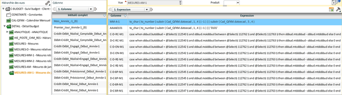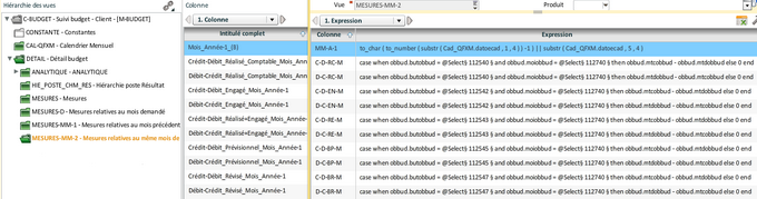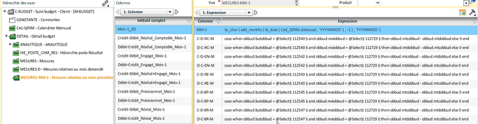 Pour les colonnes associées aux différents buts de budget, il faut procéder de la même façon que pour les colonnes de la vue "Mesures". Les colonnes Mois_Année_-1_(B) et Premier_Jour_Année-1_(B) calculent les dates de début et de fin de la période. Masquées, elles sont utilisées dans les expressions des colonnes pour obtenir un résultat équivalent à l'image ci-dessous :