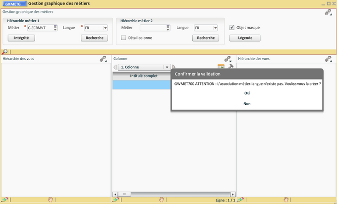 Elle se fait par duplication du métier référence "Ecritures et Mouvements - Socle" en utilisant la transaction "Gestion graphique des métiers" dans laquelle il faut nommer le métier à créer et lancer la recherche. Le message suivant s'affiche :