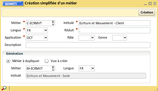 En répondant positivement à la question ci-dessus, la transaction "Création simplifiée d'un métier" s'ouvre, il faut renseigner les informations comme ci-dessous puis cliquer sur le bouton "Création"