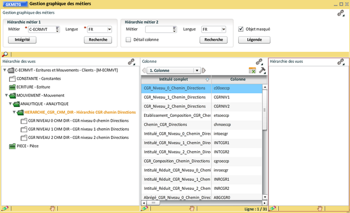 Comme pour les hiérarchies de CGR, les colonnes peuvent être réorganisées, renommées, masquées, supprimées. Quelques exemples d'actions qui peuvent être menées :