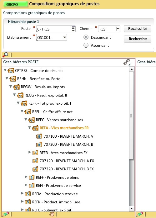 Dans cet exemple, nous allons intégrer la hiérarchie de postes "Compte de résultat", le chemin de composition est "RES" pour Résultat :