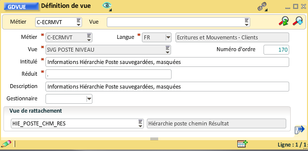 Pour rattacher la vue "Hiérarchie poste chemin Résultat" ou la vue "Hiérarchie poste" (dans le cas où vous intégez plusieurs hiérarchies de postes) à la vue "Mouvement", il faut ouvrir la gestion des vues et renseigner la vue de rattachement, le numéro d'ordre peut aussi être mis à jour :