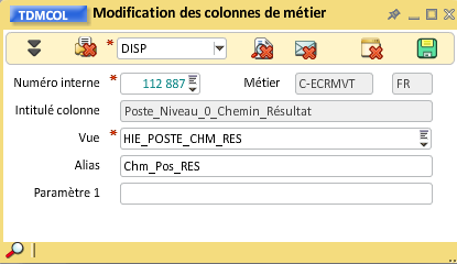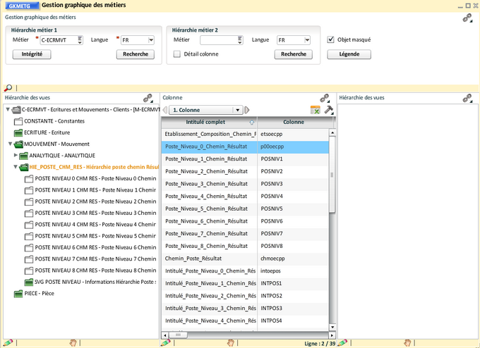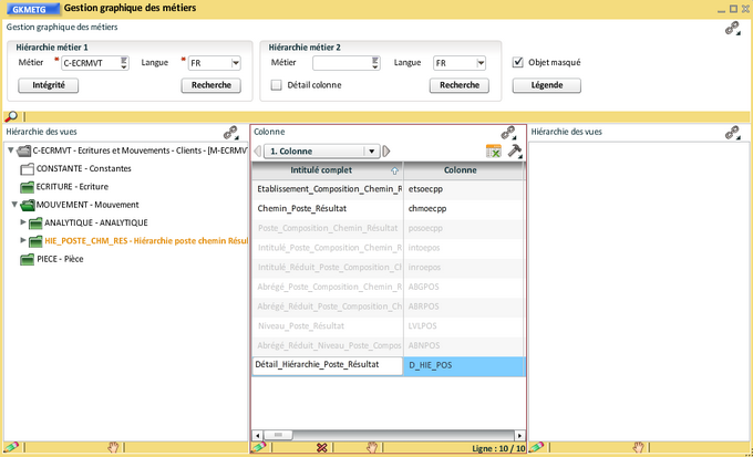 Il est possible de ne pas conserver les 9 niveaux (de 0 à 8) dans des vues séparées, comme pour les hiérarchies de CGR, nous allons déplacer toutes les colonnes restantes dans la vue "Hiérarchie poste chemin Résultat". Nous utilisons à nouveau la transaction de "Modification des colonnes de métier" ( ouverte en synchro du bloc colonne et épinglée) :