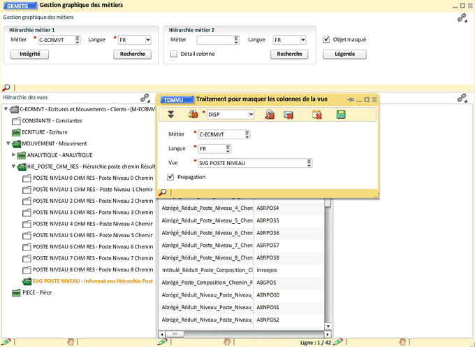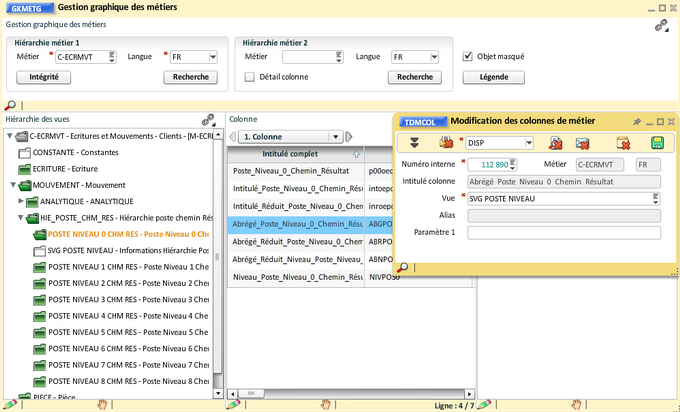Avec la transaction "Modification des colonnes de métier", on déplace dans cette vue les colonnes Abrégé_Réduit_Poste_Niveau..., Abrégé_Réduit_Niveau_Poste_Niveau..., Niveau_Poste_Niveau et tri_Poste_Niveau.... de tous les niveaux. Cette transaction est ouvert à partir des transactions liées du bloc "Colonne" et peut être épinglée.