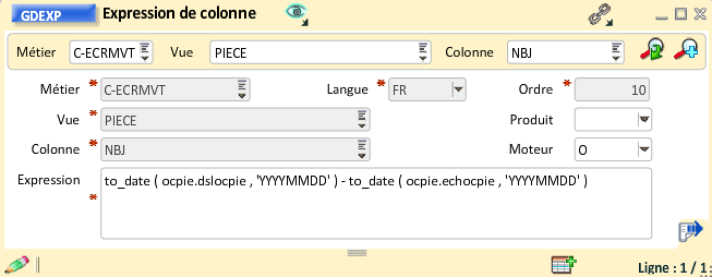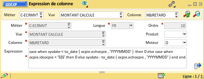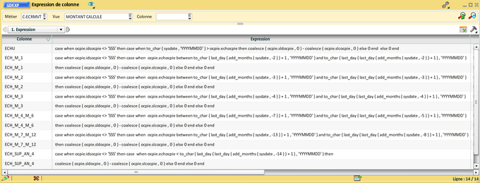 Vous pourrez créer une vue dédiée à ces informations, puis définir des colonnes. Les expressions seront de la forme suivante. Ici un exemple pour le montant débit. Il faut comparer le mois comptable du mouvement substr ( ocmvc.decocmvc 1 , 6 ) au mois calculé à partir du calendrier to_char ( add_months ( to_date ( Cad_QFXM.datoecad , 'YYYYMMDD' ) , -1 ) , 'YYYYMM' ) et dans le cas de l'égalité, sélectionner le montant ocmvc.mtdocmvc :