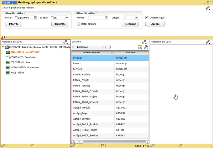 Vous pouvez réorganiser les vues et les colonnes, éventuellement masquer ou supprimer (seulement dans le cas d'un nouveau métier) certaines colonnes :