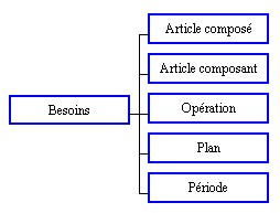 Informations : Article composé, Article composant, Indicateur composé, Quantité brute, Quantité nette, Quantité modifiée, Quantité intermédiaire, Période, Date de début, Date de fin, Politique des besoins, Mode de production, Type de ligne.