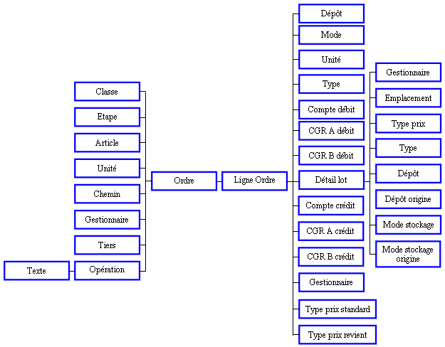 Informations : Indicateur de transfert en comptabilité, Indicateur de génération des mouvements de stocks, Indicateur de transfert en statistique, Indicateur de consommation automatique, Lot supérieur, Série du lot, Dépôt origine (Intitulés), Emplacement (Intitulé), Contenant (Intitulés), Contenant origine (Intitulés), Paramètres 1, 2 et 3 (Intitulés), Dépôt (Intitulés), Mode de stockage (Intitulés), Mode de stockage origine (Intitulés).