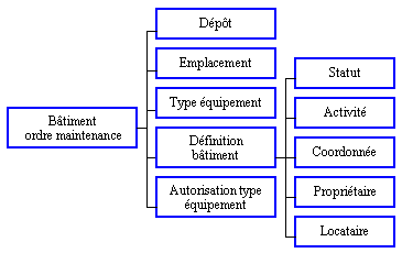 Informations : Etablissement, Bâtiment, Intitulé, Intitulé réduit, Mnémonique, Dépôt (Intitulés), Emplacement, Intitulé, Indicateur bâtiment utilisable pour les équipements, Indicateur de création automatique des équipements, Type d'équipement (Intitulés).