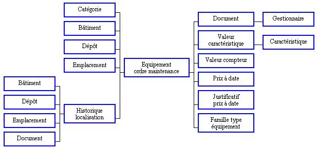 Informations : Etablissement, Type équipement, Code de l'équipement (Intitulés), Mnémonique, Clé confidentialité, Catégorie (Intitulés), Famille Type Equipement (Intitulés), Marque (Intitulés), Famille Type Equipement 2 (Intitulés), Bâtiment (Intitulés), Dépôt (Intitulés), Emplacement (Intitulés), Indicateur de demande d'intervention préventive, Date de mise en service, Date de fin de service, Date de début du préventif, Date de début de garantie, Date de fin de garantie.