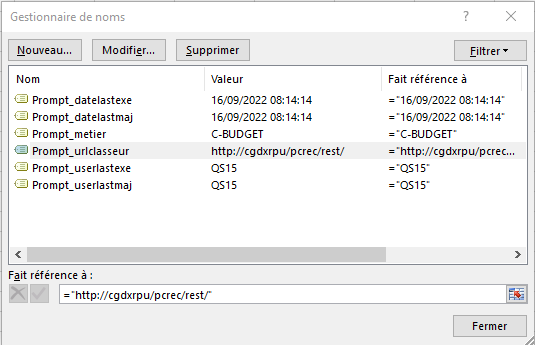 L'URL d'actualisation du classeur est également enregistrée comme gestionnaire de nom : Prompt_urlclasseur;