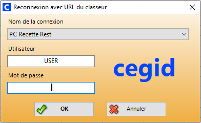 Lorsque le rafraîchissement d'une requête est demandé dans Excel, l'URL d'actualisation du classeur est recherchée (1ère requête Cegid XRP Ultimate du classeur). Si celle-ci est différente de l'URL de connexion, la connexion à l'URL d'actualisation est demandée. Une fenêtre de "Reconnexion avec URL du classeur" s'affiche automatique.
