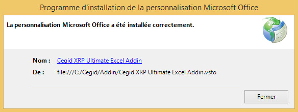 Lancer l'installation avec 'Cegid XRP Ultimate Excel Addin.vsto' ou le setup.exe depuis le répertoire de déploiement (map réseau ou répertoire du poste) puis suivre les indications.