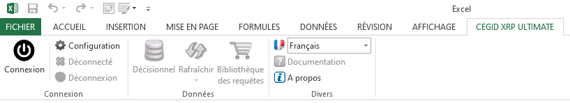 Pour utiliser ce module, vous devez lancer Excel. Vous trouvez l'onglet "CEGID XRP ULTIMATE" dans le menu supérieur.