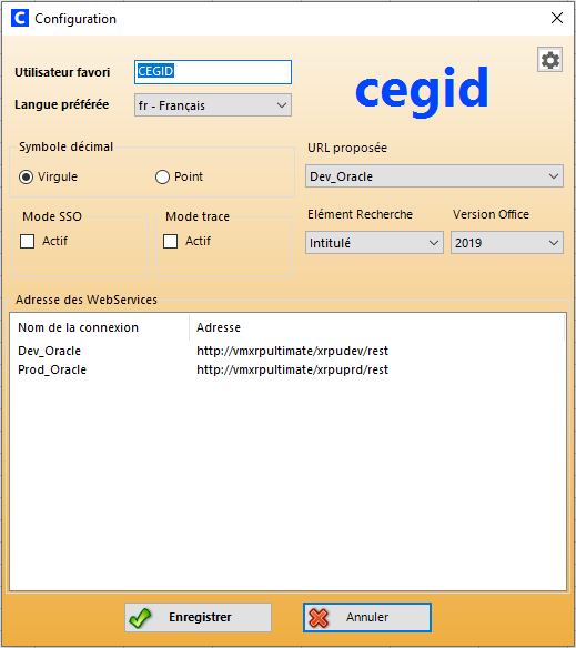 * La zone Utilisateur favori permet de saisir le code utilisateur qui sera proposé lors de la phase de connexion (hors SSO).