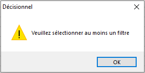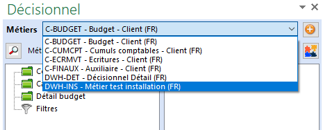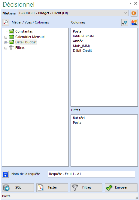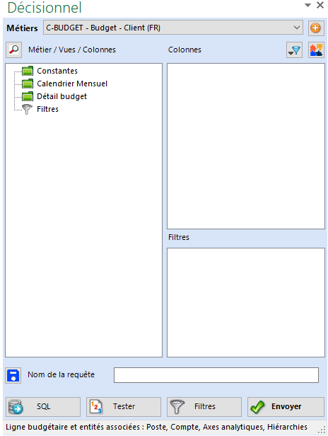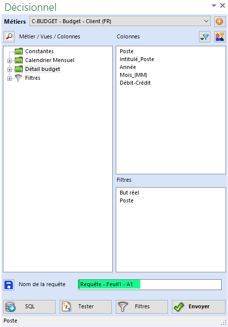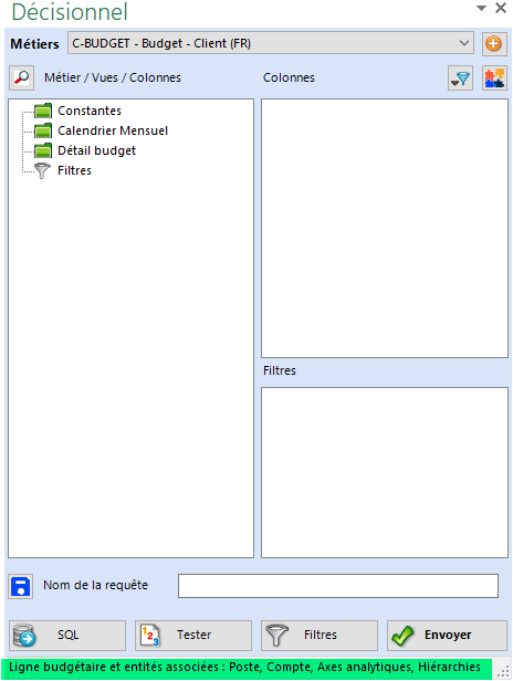 Le bouton Décisionnel permet d'ouvrir le panneau de constitution de la requête. Ce bouton n'est actif que si l'utilisateur est connecté et a le droit de création de requêtes pour au moins un métier.