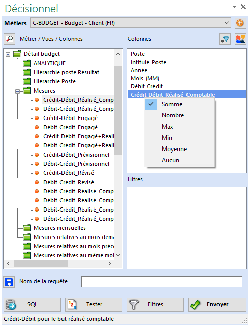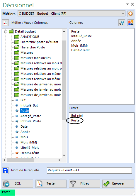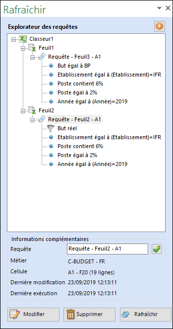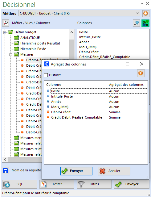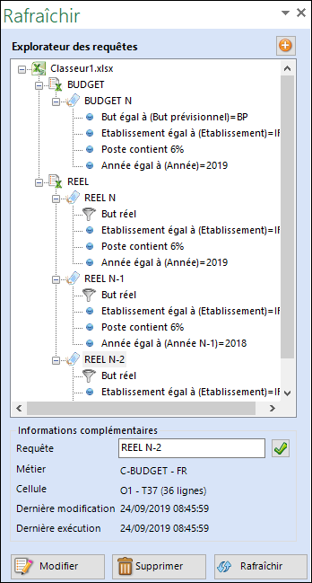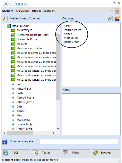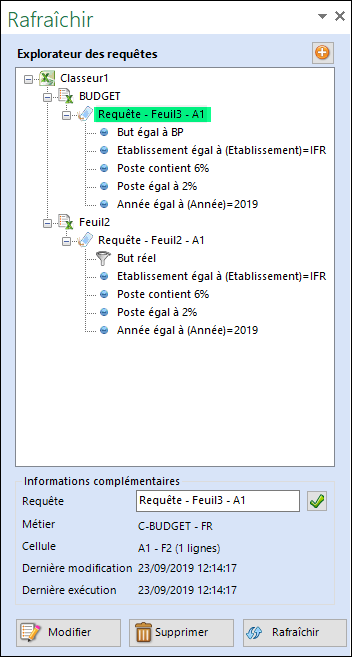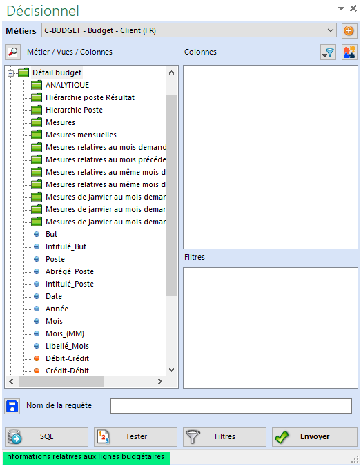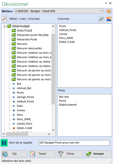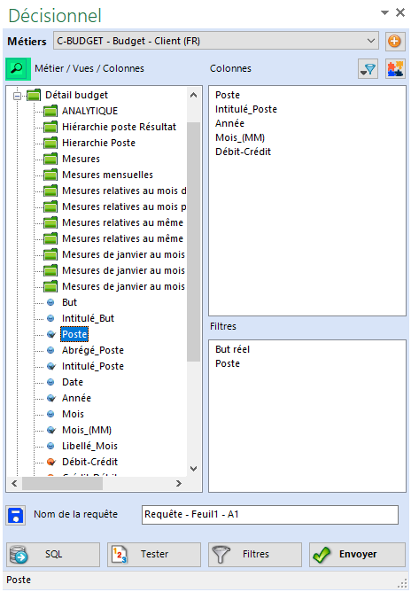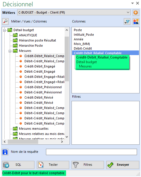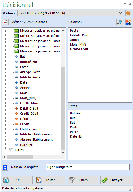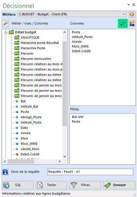 Le bouton Modifier permet d'afficher la requête sélectionnée dans le panneau Décisionnel comme la modification depuis l'explorateur des requêtes. Tous les éléments de la requête (colonnes, filtres, valeurs des invites) sont enregistrés en base de données.