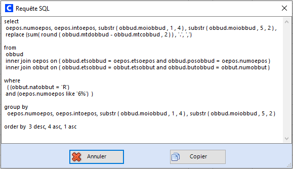 Le bouton SQL permet la visualisation du code SQL associé à la requête, SQL qui sera lancé par le service QueryBI.