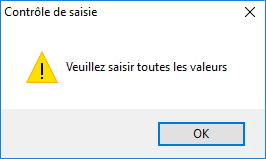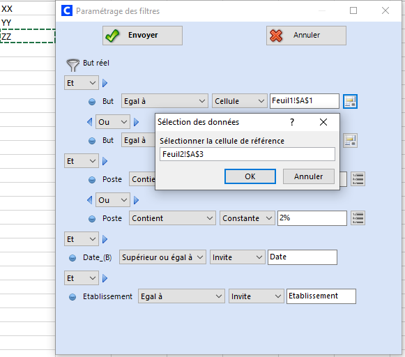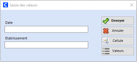 En positionnant le curseur sur la ligne Classeur1, la fenêtre de Saisie des valeurs ci-dessous s'affiche, elle correspond aux invites des trois requêtes :