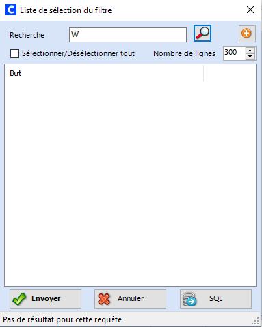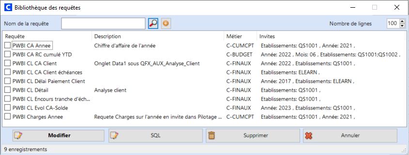 Ce bouton Bibliothèque des requêtes permet la gestion des requêtes enregistrées en base de données. Ce bouton est soumis au module 'QUERYBI'.