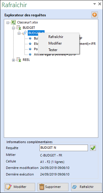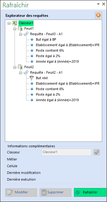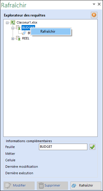 Cette fonctionnalité accessible sous le groupe Données via le menu sous Rafraîchir, permet de recenser l'ensemble des requêtes du classeur créées par Excel Addin afin de les sauvegarder aisément en base de données en deux clics.