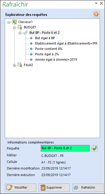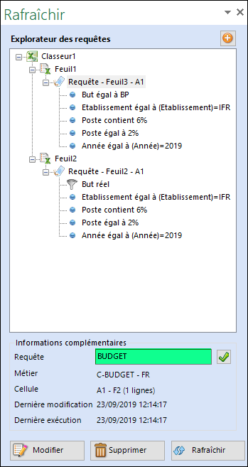 Dans l'exemple ci-dessus, la feuille BUDGET contient une requête :