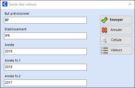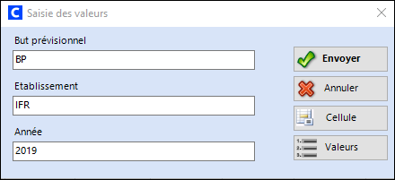 En positionnant le curseur sur la ligne BUDGET, la fenêtre de Saisie des valeurs ci-dessous s'affiche, elle correspond aux invites de la requête BUDGET N :