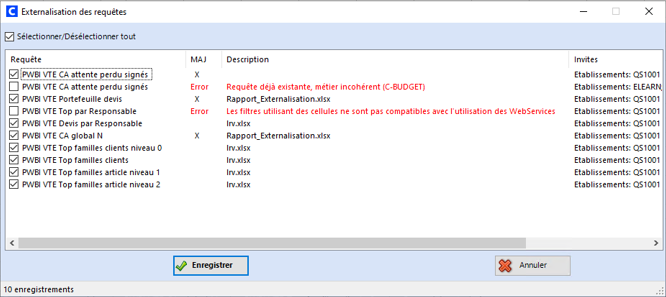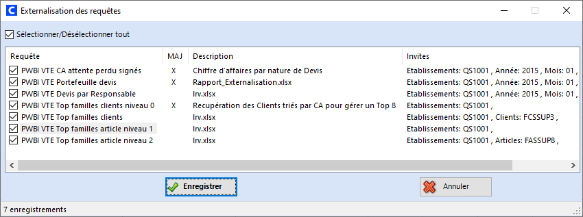 Le bouton Enregistrer permet la sauvegarde des requêtes cochées en base de données.