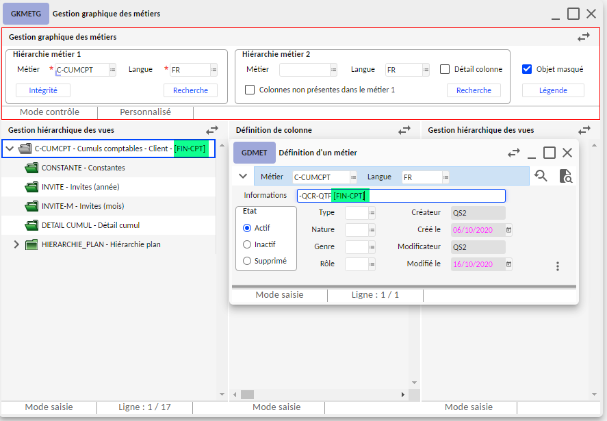 Dans l'exemple ci-dessus, pour le métier C-CUMCPT, créé à partir du métier référence FIN-CPT, l'aide s'ouvre sur la documentation du métier référence.