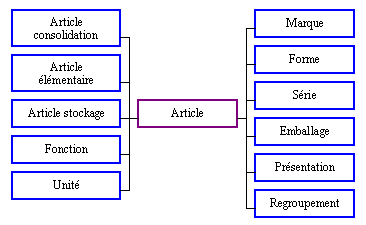Informations : Code EAN, Code ITF, Marque (intitulés), Présentation (intitulés), Forme (intitulés), Emballage (intitulés), Regroupement (intitulés), Série (intitulés), Article de conditionnement (intitulés) et coefficient, Article stocké (intitulés) et coefficient, Article déterminant (intitulés) et coefficient, Fonction, Péremption.